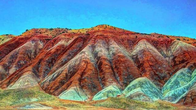 Should you drive on the road from Zanjan city to Mahneshan town, you will catch sight of the glorious colorful mountains of Mahneshan or Aladaghlar, of course in day light. In case you travel night time, you will miss this magnificent natural wonder.