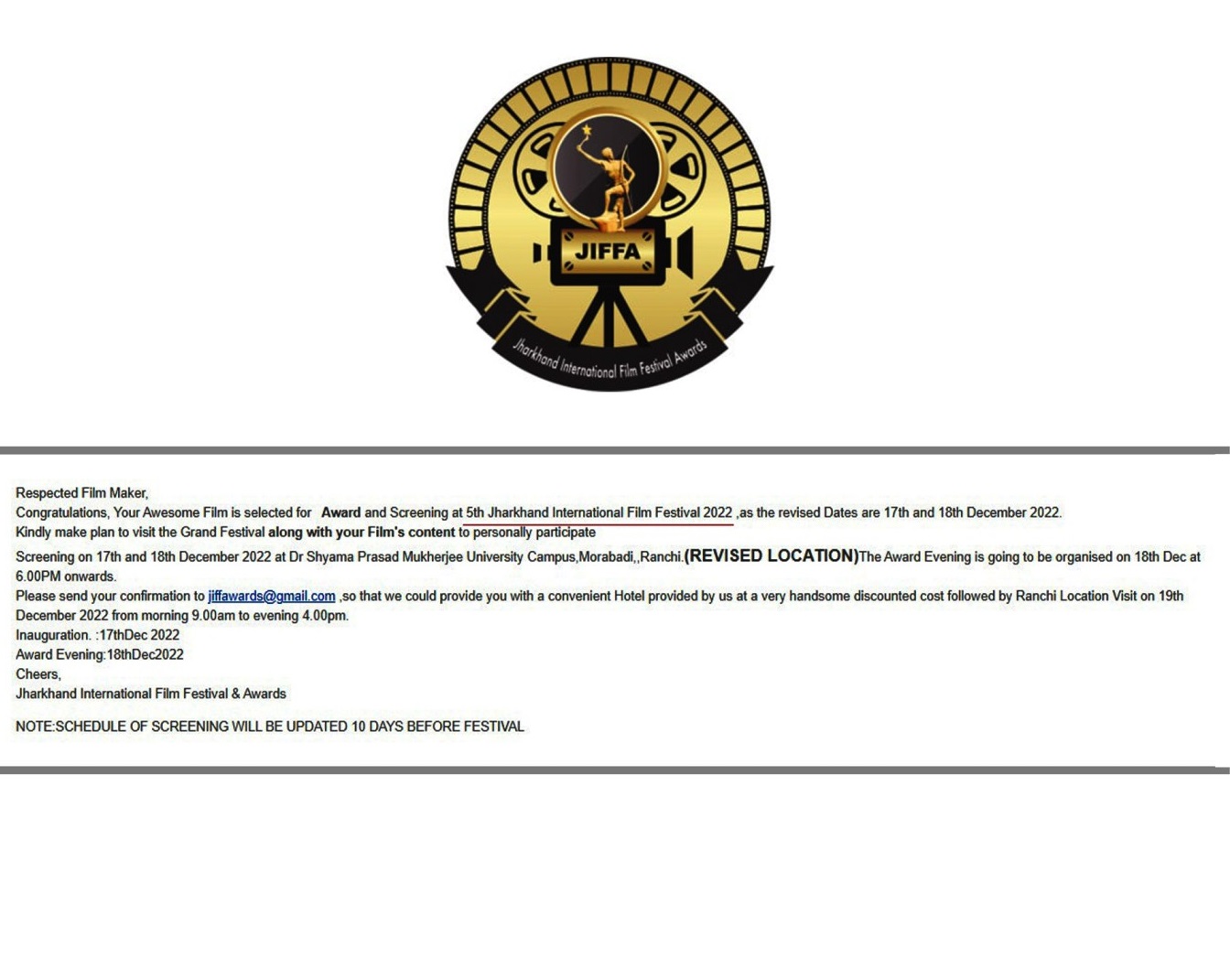 The Jharkhand International Film Festival Awards are a set of awards presented annually to filmmakers and artists for their contribution to Cinema.